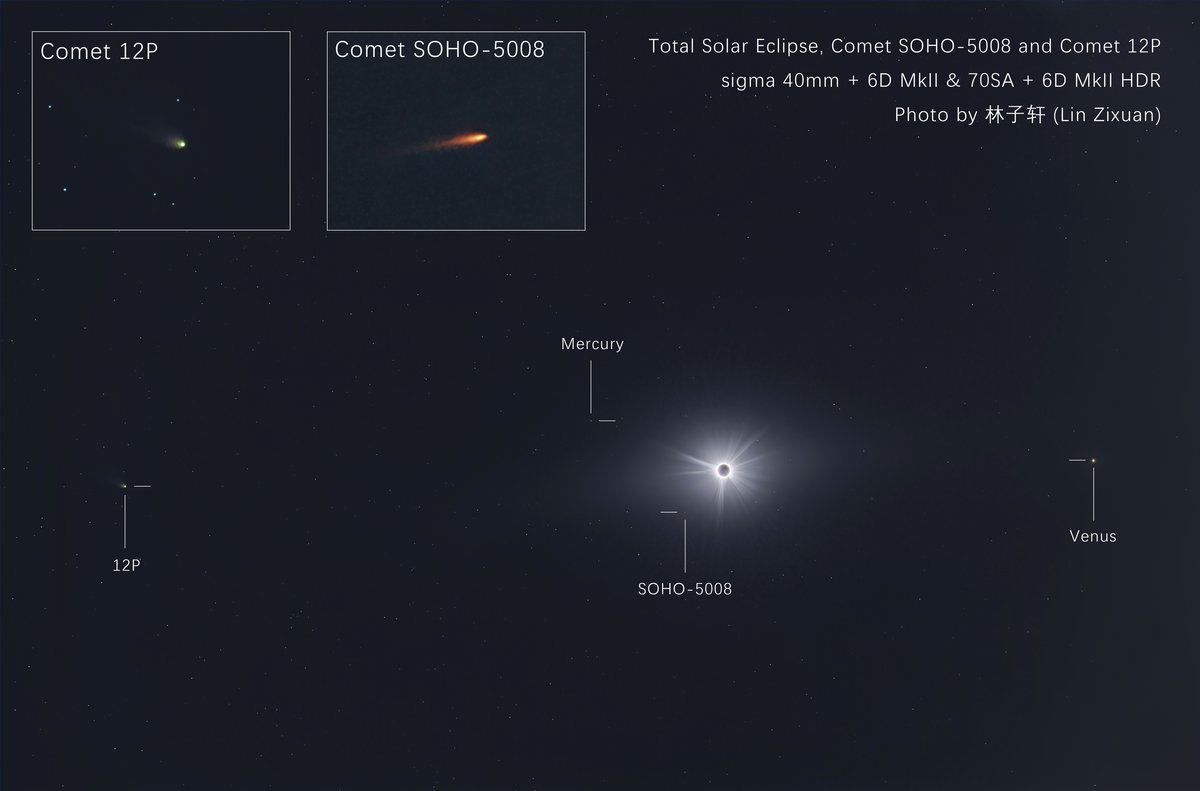 Китайский астроном-любитель Линь Цзысюань, фотографировавший затмение, заснял, как комета SOHO-5008 развалилась на части. Саму комету обнаружили несколькими часами ранее; она получила название благодаря тому, что была замечена на изображениях космической обсерватории SOHO.