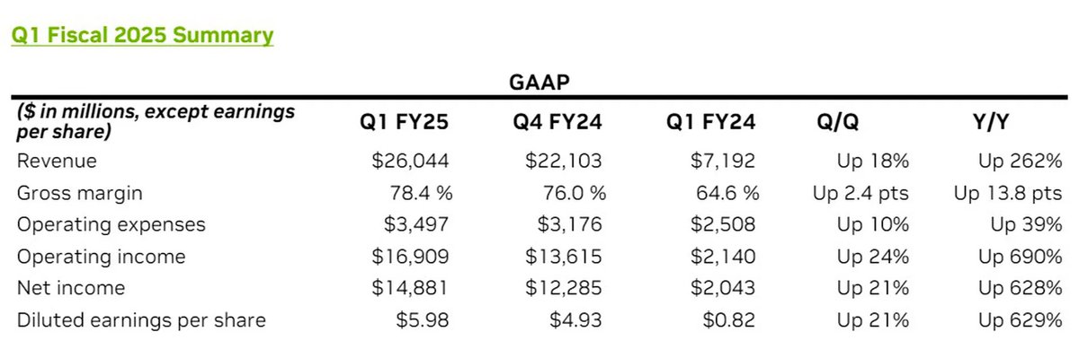 За первый квартал 2025 финансового года Nvidia показала выручку в $26 миллиардов — на 262% больше, чем год назад. Чистая прибыль компании достигла $14.8 миллиарда, на 628% больше по сравнению с прошлым годом.