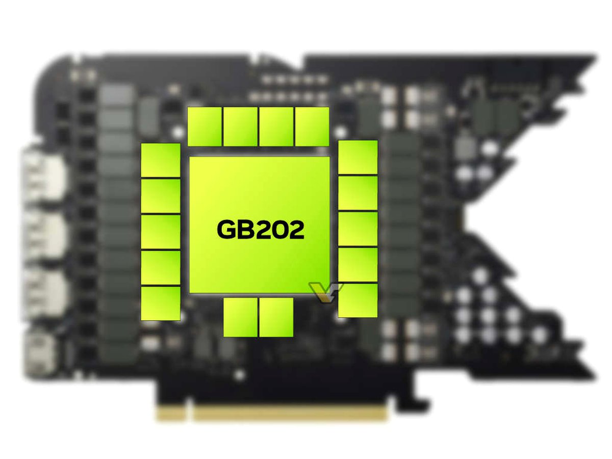 Утверждается, что компоновка модулей памяти у GeForce RTX 5090 будет следующей: по 5 модулей слева и справа от GPU, 4 модуля сверху и 2 модуля снизу. Предполагается, что увеличить число модулей пришлось из-за повышения ширины шины памяти до 512 бит.