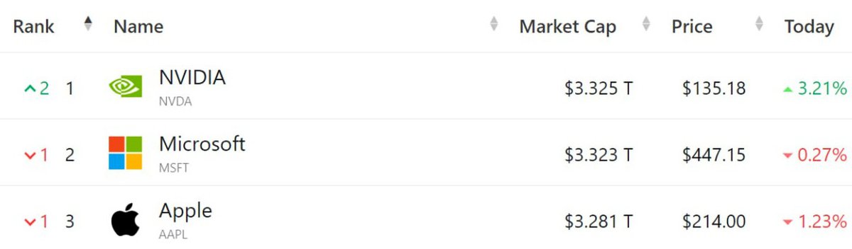 В начале торговой сессии Nvidia занимала третье место в мире по капитализации, уступая Microsoft и Apple. В ходе торгов стоимость акций Nvidia выросла на 3.21%, а цены на акции Microsoft и Apple несколько снизились.