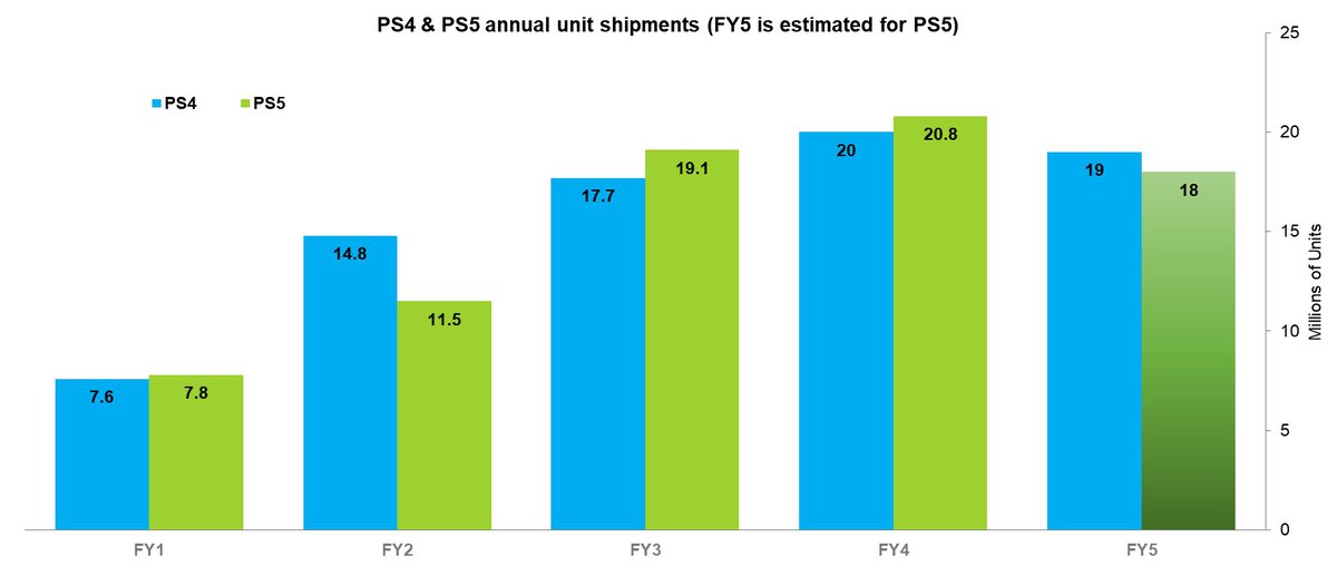 На пятый год после запуска, считают аналитики, PlayStation 5 все-таки уступит PlayStation 4. Пока PlayStation 4 опережает PlayStation 5 по продажам (за то же время после выпуска) примерно на 1.1 миллиона устройств.