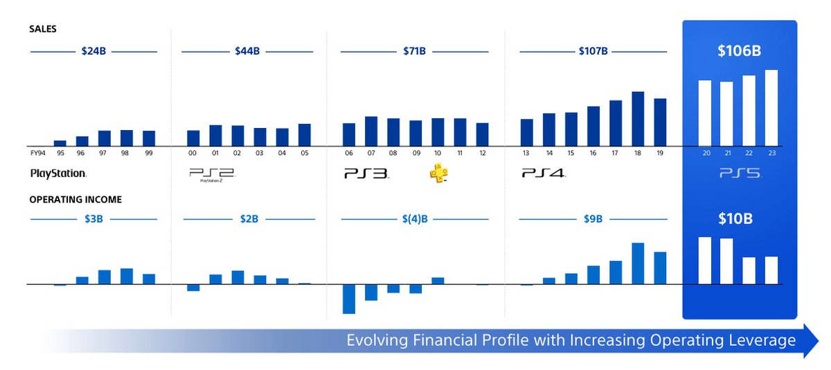 - Нынешнее поколение PlayStation — самое прибыльное в истории компании. По выручке оно пока уступает предыдущему ($106 миллиардов против $107), зато по операционной прибыли PlayStation 5 впереди ($10 миллиардов против $9 миллиардов).