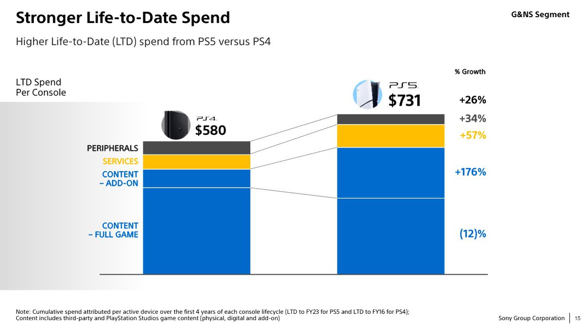- По тратам на игры владельцы PlayStation 5 тоже обходят игроков с PlayStation 4. Владельцы новой консоли активнее тратят на дополнительный контент и сервисы, но меньше покупают сами видеоигры.