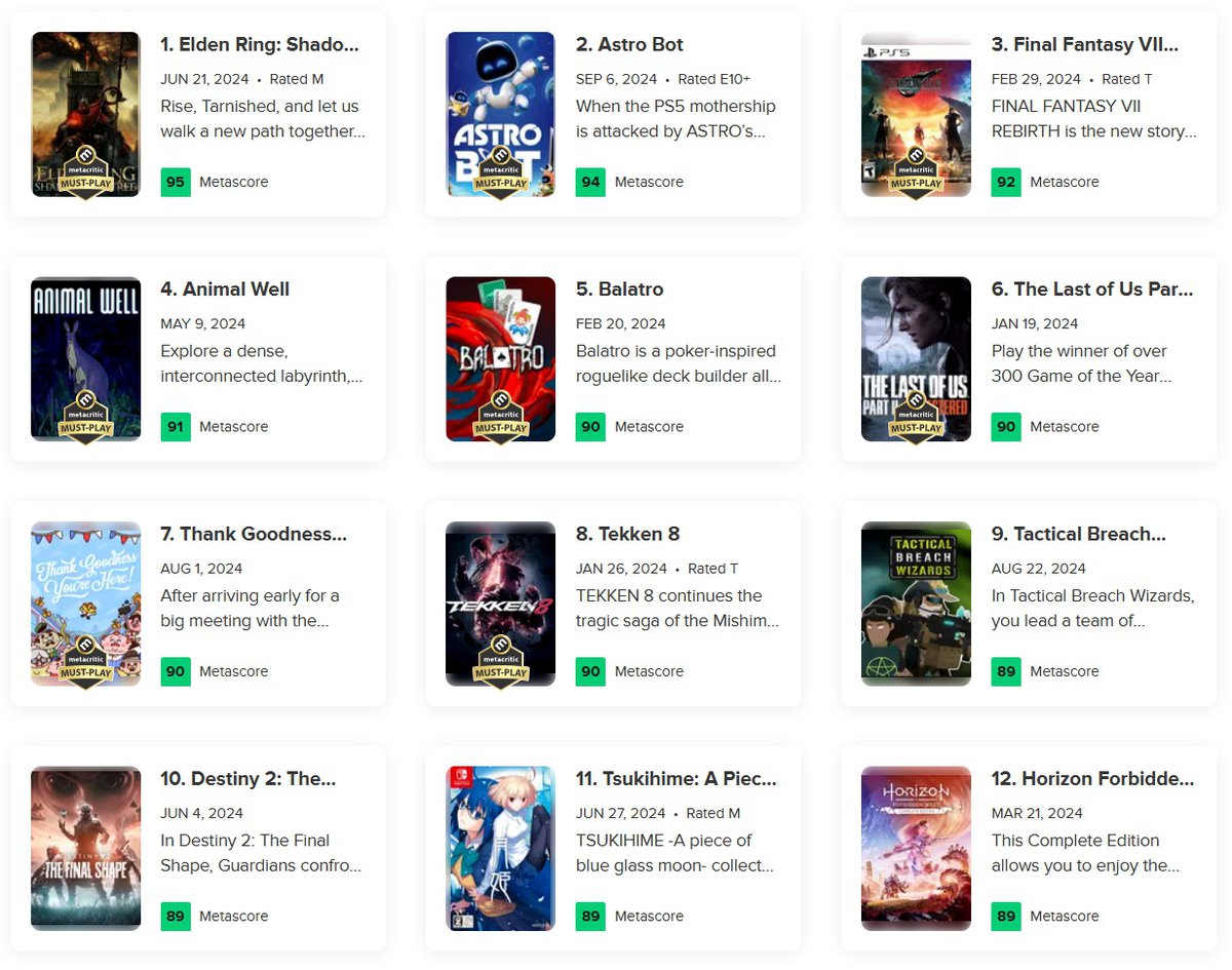 Примечательно, что в 2024 году вышли всего три игры, набравших на Metacritic свыше 90 баллов из 100. Кроме того, Astro Bot стала единственной новой игрой Sony, попавшей в топ-50 Metacritic за 2024 год; следом идет Helldivers 2, занимающая 54 место.