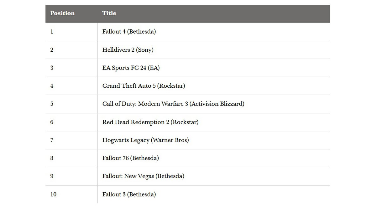 Примечательно, что большая часть продаж Fallout (69%) приходится на версию для PC. Также в топ попала Fallout 76, занявшая восьмую строчку, Fallout New Vegas, поднявшаяся на девятое место, и Fallout 3, обосновавшаяся на десятом месте.