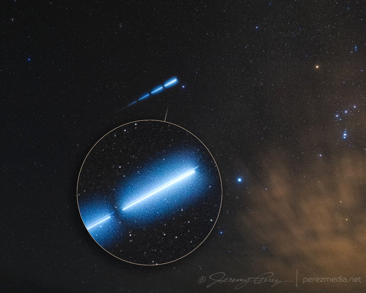 Пунктир, попавший на фотографии Переса, представляет собой горящие обломки второй ступени Falcon 9. Линия получилась длинной и прерывистой, потому что фотограф снимал с долгой выдержкой; разрывы это моменты, когда закрывался затвор камеры.