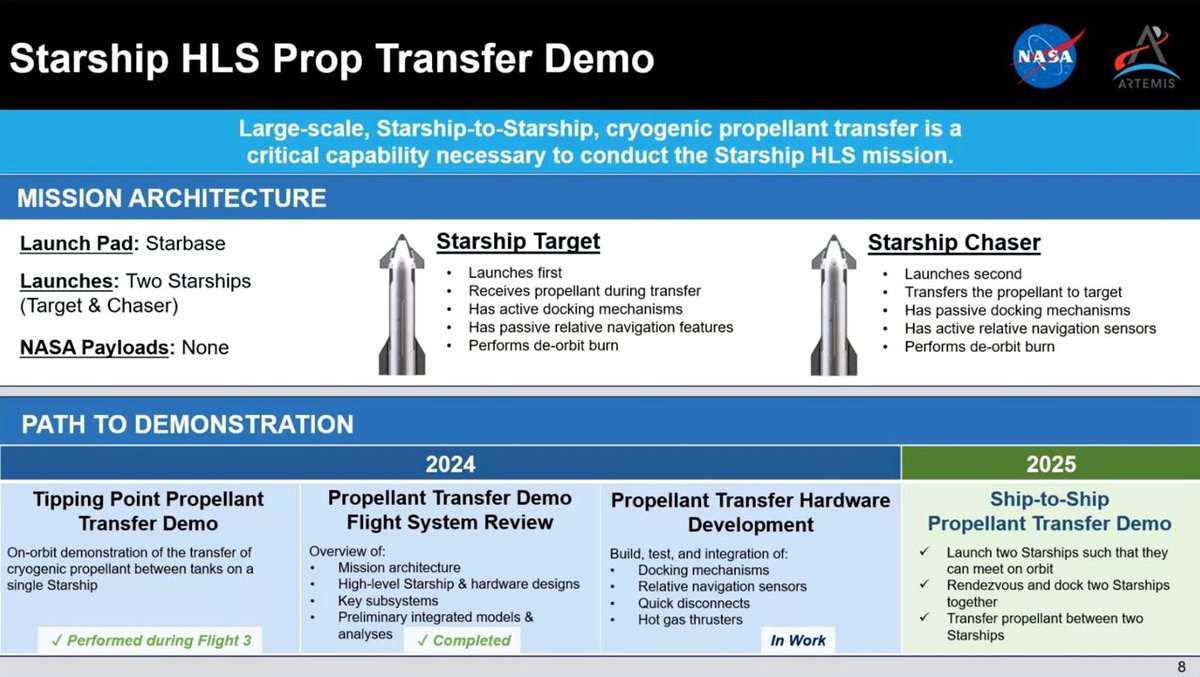 SpaceX и NASA планируют провести первую дозаправку на орбите в 2025 году. О том, когда именно это произойдет, не сообщается.