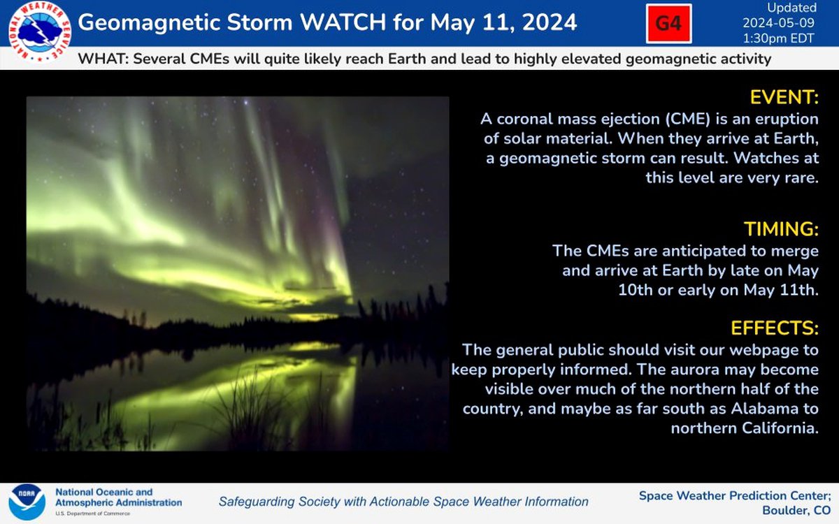 Кроме того, взаимодействие земной атмосферы и магнитного поля с частицами солнечного ветра, вызывающими геомагнитные бури, обычно приводит к возникновению северных сияний. Чем больше частиц добирается до Земли, тем мощнее северные сияния; вероятно, на этот раз они будут особенно зрелищными.
