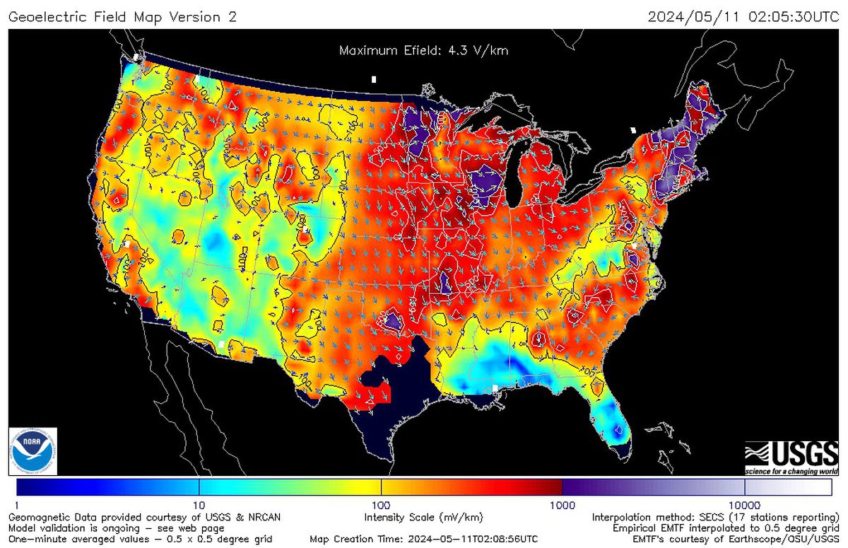 Геомагнитный шторм стал причиной геоэлектрической бури, прошедшей почти по всей территории страны. Вдоль восточного побережья и на Среднем Западе сила электрических токов, проходивших через землю и камни, превысила норму в 10000 раз.