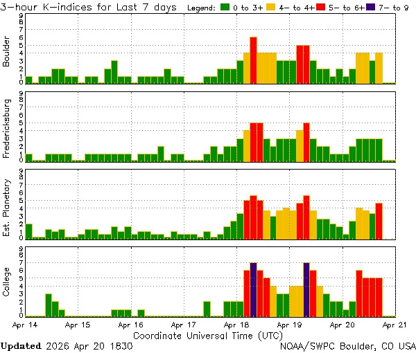 20 апреля в ряде регионов Земли наблюдается магнитная буря класса G1. Шторм начался неожиданно: прогнозы NOAA США и британского Met Office говорили о возмущении магнитосферы ниже буревого уровня.