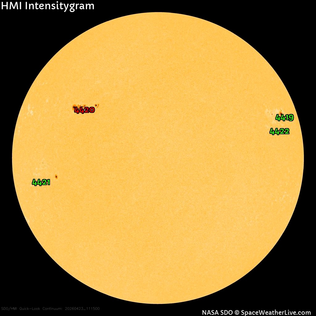 Хотя сильные магнитные бури 24 апреля не ожидаются, в этот день могут произойти довольно мощные вспышки на Солнце. Пятно AR4420, в последние дни наращивавшее активность, наконец сменило магнитное поле на самую опасную конфигурацию: бета-гамма-дельта.