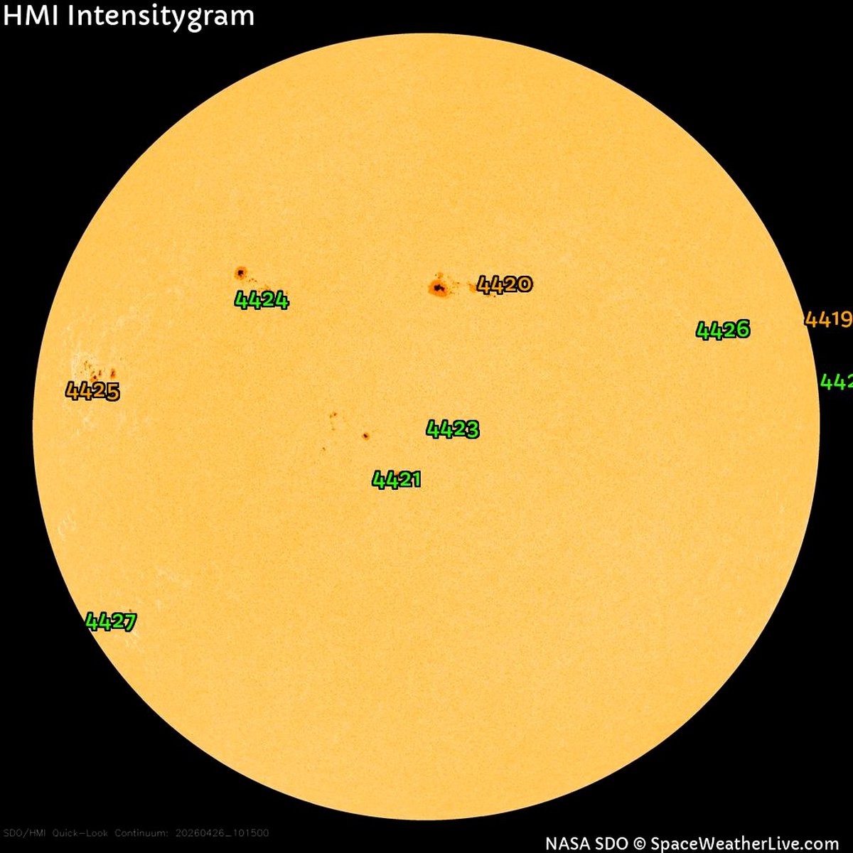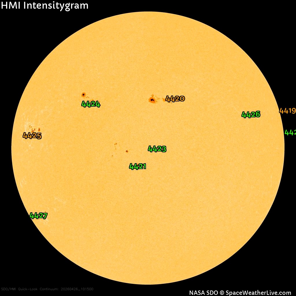 Пятно AR4425 пока демонстрирует частые, но слабые вспышки — в худшем случае предмаксимального класса M. Однако оно тоже может в более-менее любой момент перейти к более высокой активности.