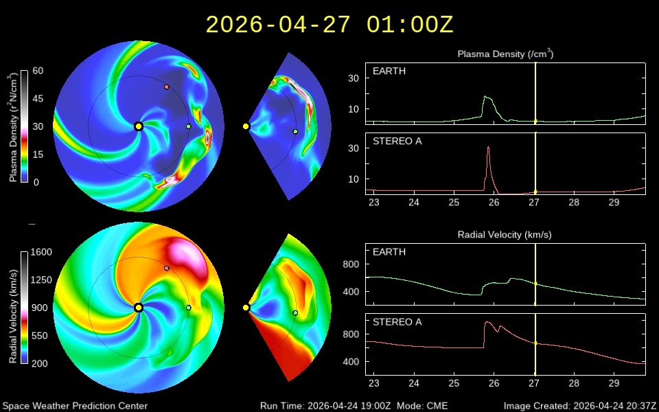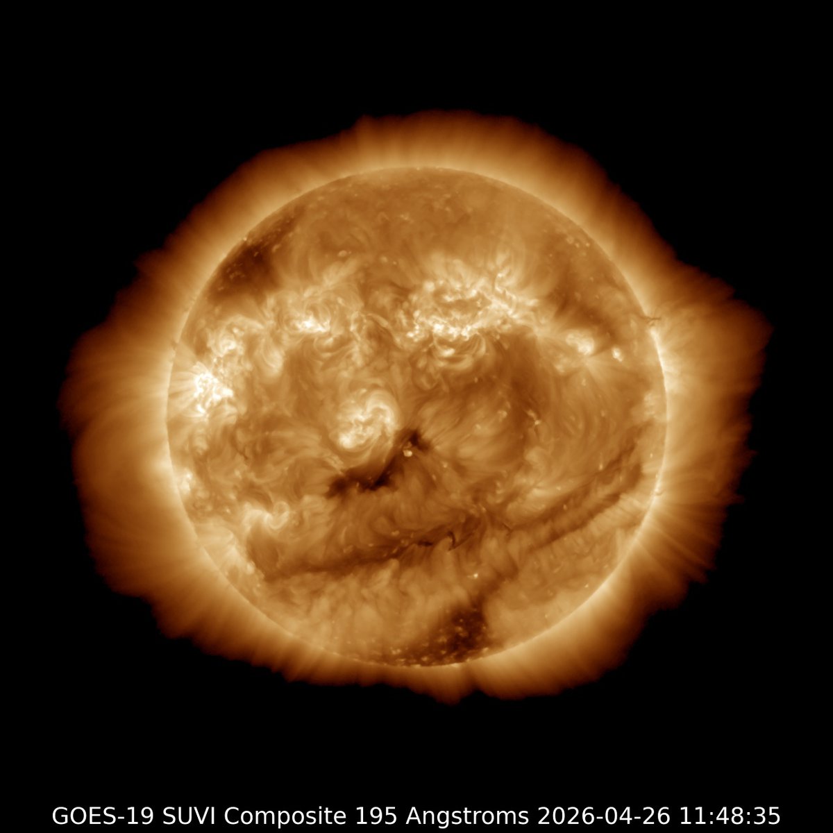 Во-первых, где-то «потерялась» геомагнитная буря, ожидавшаяся рано утром 26 апреля. В это время Земля должна была пересечься с корональным выбросом массы Солнца, но никакой магнитной бури так и не произошло.