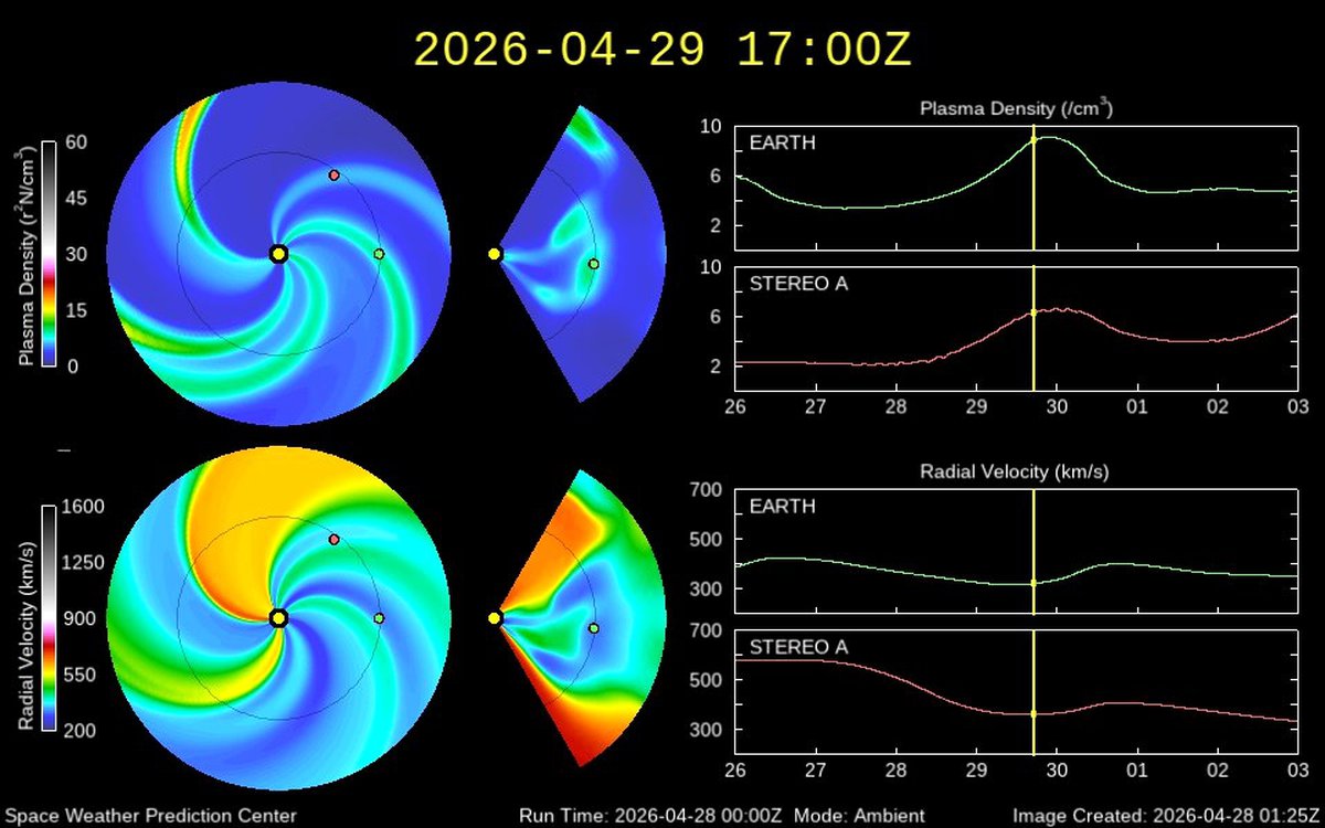 Согласно модели распространения солнечного ветра WSA-Enlil, Земле предстоит пройти через несколько потоков солнечной плазмы, воздействующих на магнитосферу планеты. Первый из таких потоков пересечется с нашей планетой как раз 29 апреля.