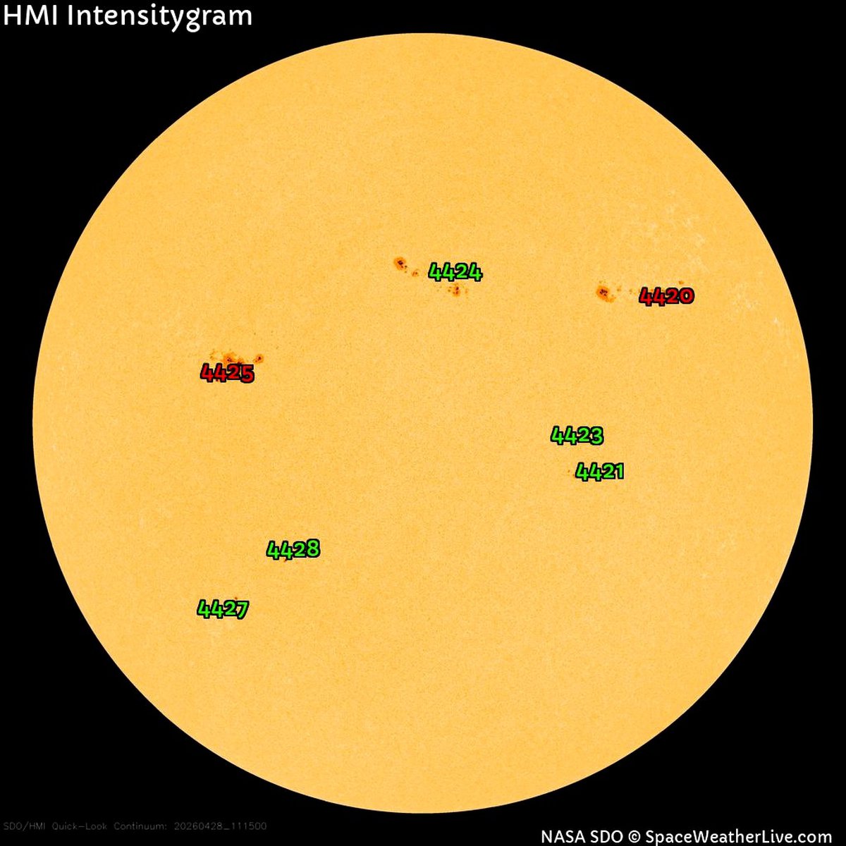В последние дни пятно AR4420 демонстрирует особо высокую вспышечную активность, пятно AR4425 ведет себя спокойнее. Однако аналитики все равно повысили вероятности вспышек максимального класса X и предмаксимального класса M до 25% и 70% соответственно.