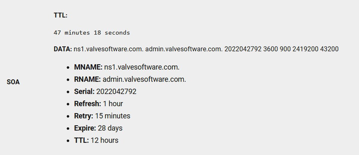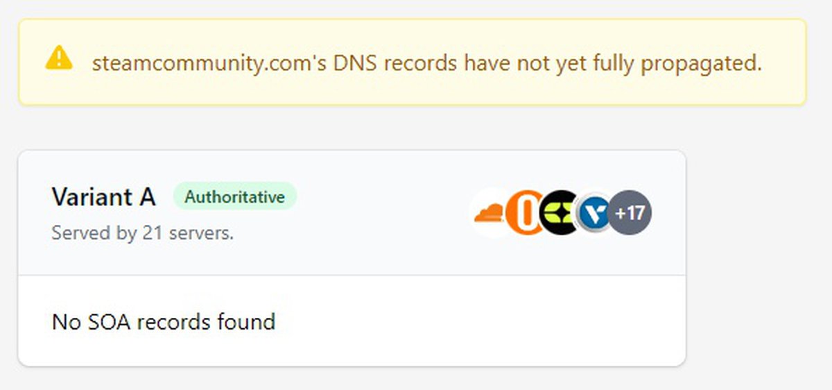 На некоторое время домен steamcommunity.com лишился SOA-записи. В записи этого типа хранится эталонная информация о домене: например, время кэширования информации DNS-серверами и тайминги синхронизации.