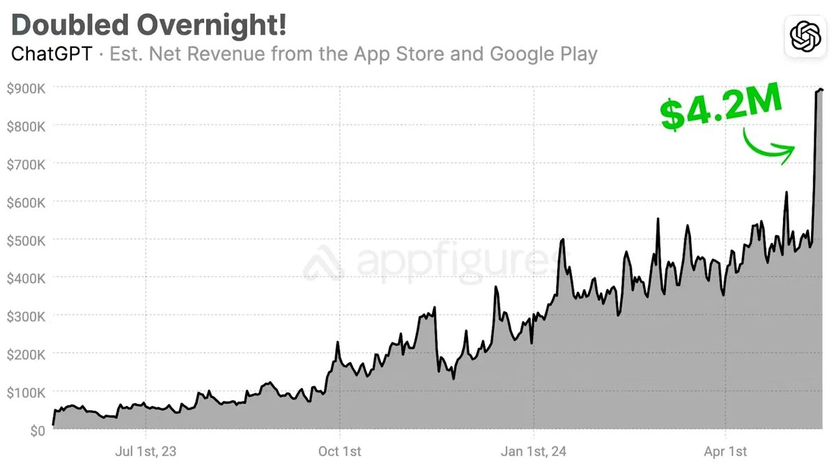 По данным компании, после релиза новой модели был зафиксирован рекордный рост доходов мобильного приложения OpenAI. Уже на второй день выручка мобильного приложения выросла до $900 тысяч против $491 тысячи днем ранее.