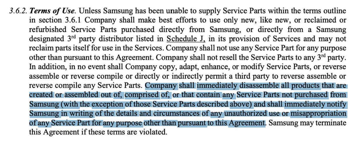 В рамках контракта Samsung обязуется напрямую продавать мастерским запчасти для ремонта своей продукции. Взамен мастерская берет на себя обязательство «немедленно разбирать» все устройства, содержащие неавторизованные запчасти.