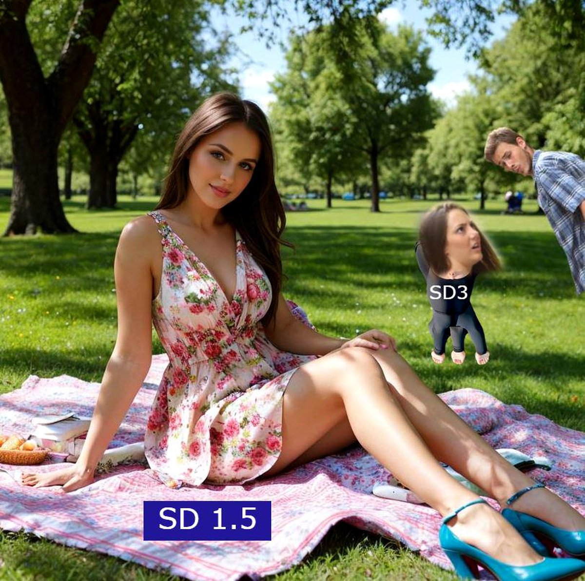 Нейросеть Stable Diffusion 3, вышедшая в середине июня, не очень хорошо справляется с человеческой анатомией; предполагалось, что ее дополнительно зацензурировали, чтобы модель не использовалась для генерации нюдсов. По словам бывшего разработчика Stable Diffusion, занимающегося Comfy UI, это не так.