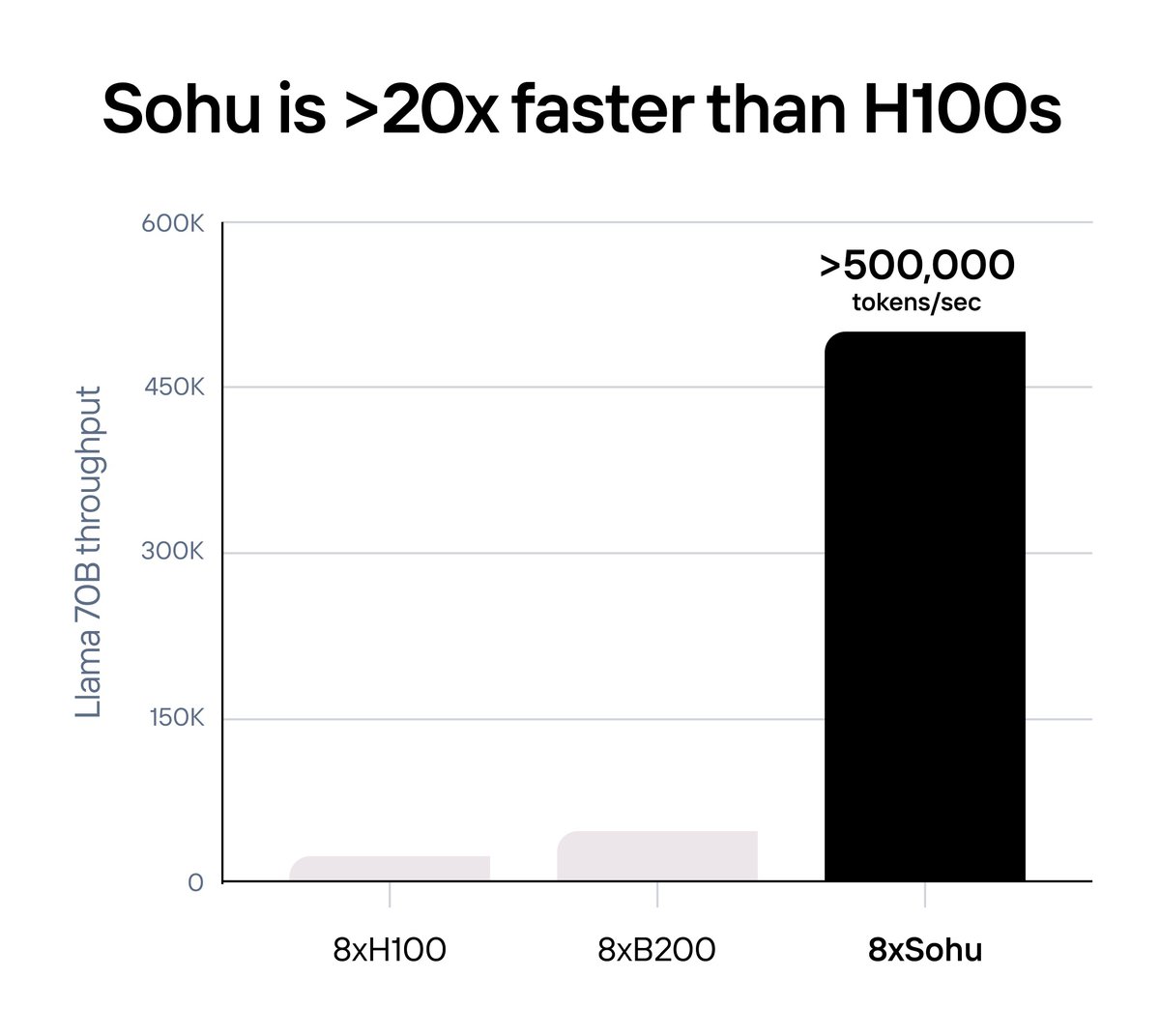 По оценке компании, в сравнении с новейшим ускорителем B200 от Nvidia Sohu более чем в 10 раз быстрее и в то же время дешевле. Например, один сервер с 8 ускорителями Sohu может обрабатывать больше 500 тысяч токенов в секунду при работе с моделью Llama 70B.