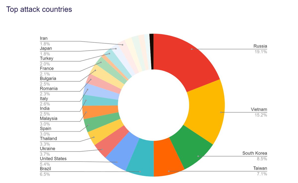 Атака велась ботнетом, в основном состоящим из систем с российскими и вьетнамскими IP-адресами. Также в топе были атакующие из Южной Кореи, Тайваня, Бразилии и США, но суммарно их заметно меньше, чем атакующих из России и Вьетнама.