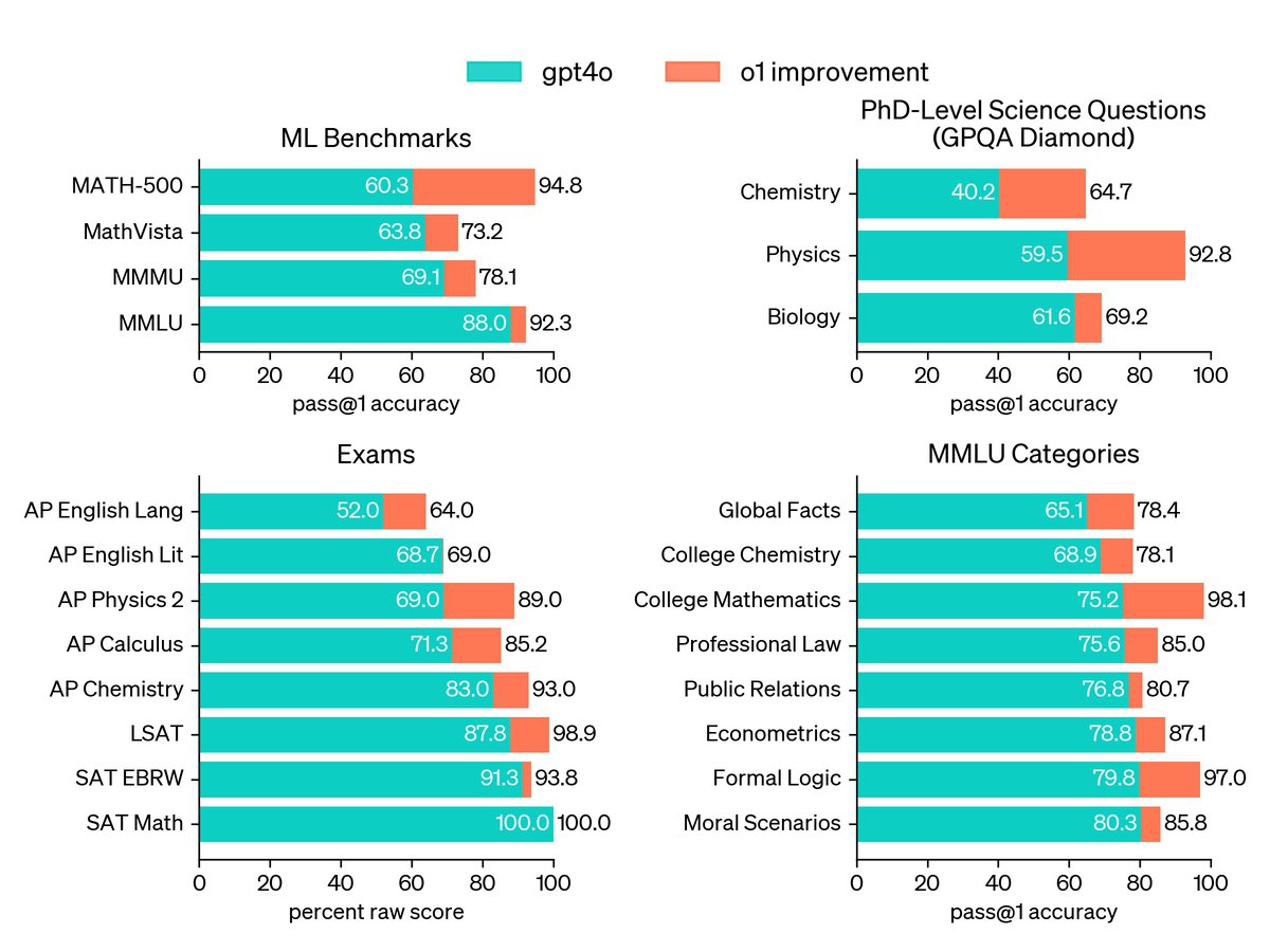 Кроме того, o1 превосходит GPT-4o по «широкому спектру бенчмарков». В основном речь идет о задачах, связанных с точными науками вроде математики, химии или физики; с логикой и биологией у новой модели тоже все в порядке.