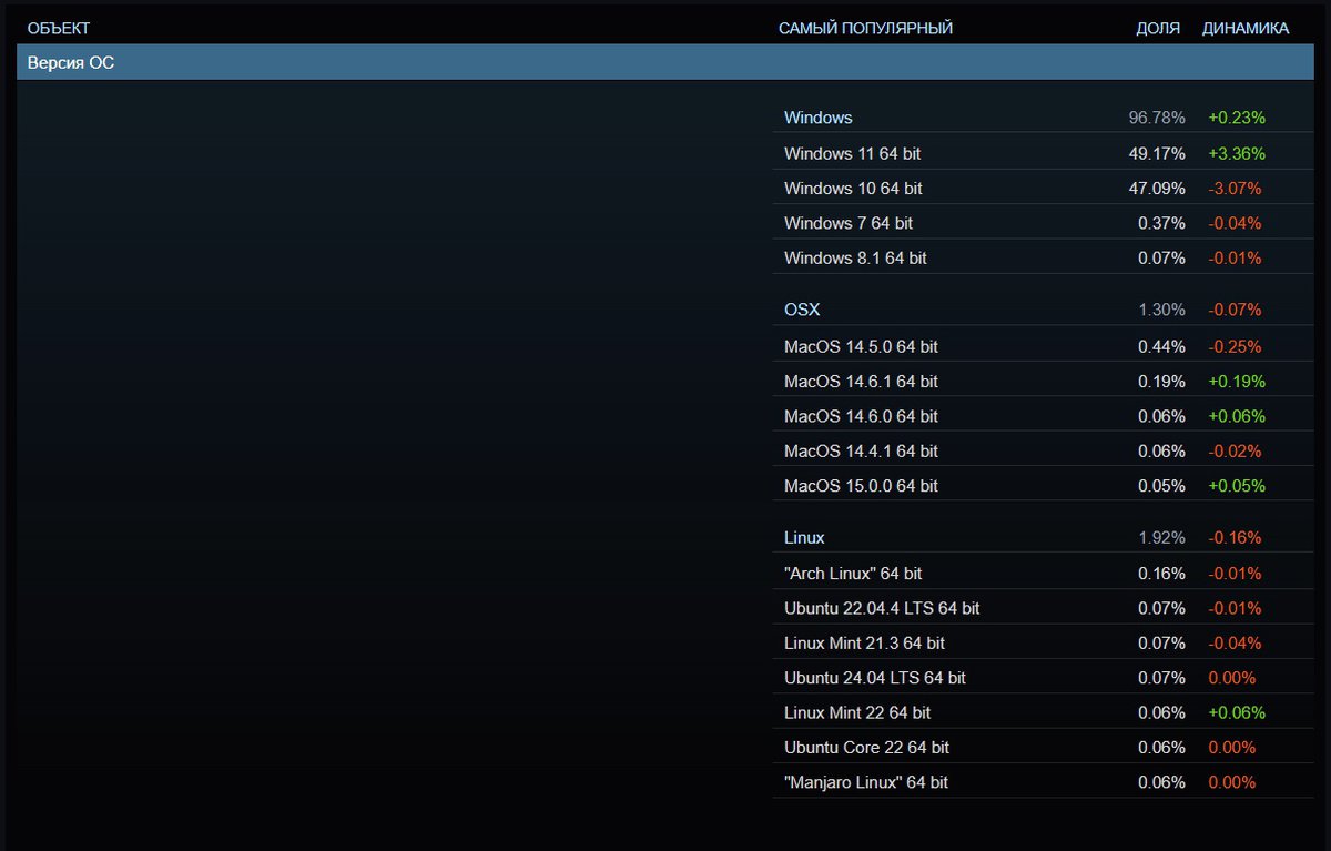 Windows 11 впервые стала самой популярной операционной системой у пользователей Steam. В августовской статистике на долю Windows 11 приходится 49%, доля Windows 10 снизилась до примерно 47%.